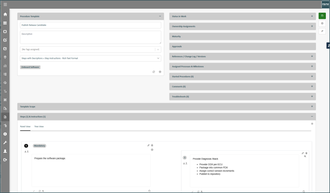 Derive specific procedures or checklists from your templates per event (for instance per  design review etc.). Assign applicable ownerships to each procedure to manage the responsibilities per event.